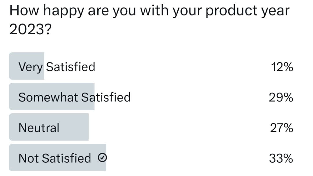 Plus in the image below, you will see an interesting poll by a Twitter product peer, where he was asking his followers the level of their satisfaction with the product they worked on in 2023. As you can see, most of them were not satisfied at all.